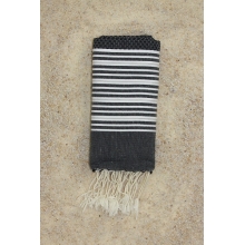 Fouta nid d'abeille Modèle Diane, création exclusive de Mille et une fouta, 1x2m Fond noir et rayures bleu turquoise.